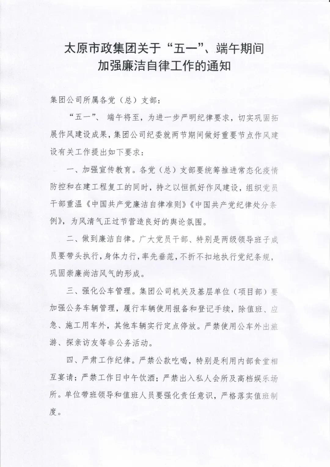 太原市政集團關于“五一”、端午期間加強廉潔自律工作的通知