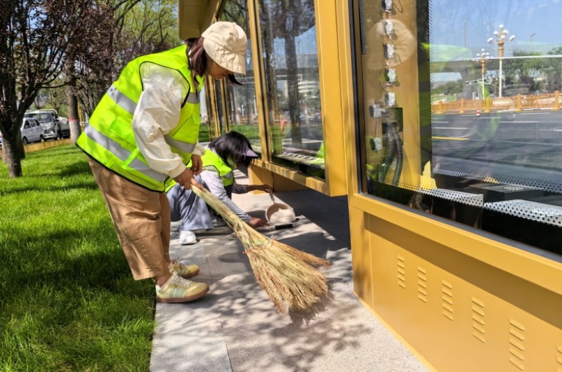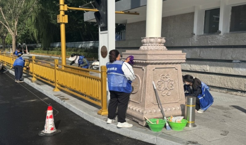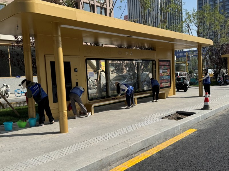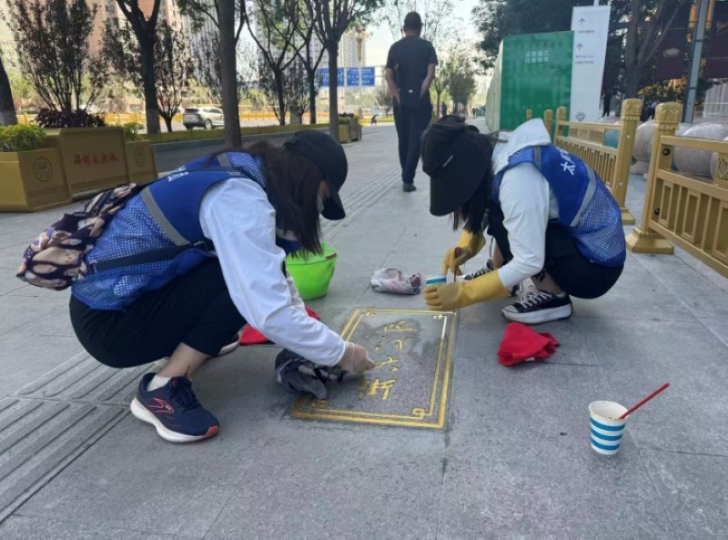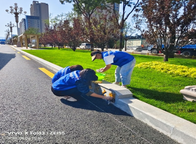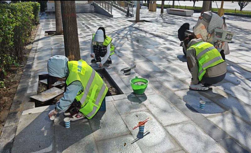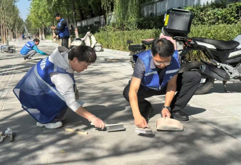 活動自9月4日起為期六天,覆蓋迎澤大街(西段)全線,重點圍繞附屬設(shè)施清潔與道路精細(xì)化維護(hù)展開?;顒又?,身著統(tǒng)一藍(lán)色“太原市政集團(tuán)”馬甲的志愿者們,手持長柄擦洗器、水桶、抹布、鏟刀、掃帚等工具,對道路兩側(cè)公交站臺、路燈基地、護(hù)欄、照明燈桿等設(shè)施進(jìn)行系統(tǒng)清理與擦洗;同步推進(jìn)地磚灌縫精細(xì)化維護(hù)作業(yè),通過專業(yè)操作,確保每一條裂縫都“嚴(yán)絲合縫”,有效提升路面耐用性與通行舒適度,以實際行動為市民出行安全與舒適保駕護(hù)航;同時,志愿者專門對道路沿線的石頭字景觀展開描金作業(yè),細(xì)刷蘸取金色涂料,一筆一畫精心描摹,成為主干道上一道兼具文化氣息與視覺美感的獨特風(fēng)景。
