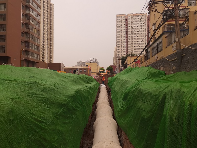 該工程是在利用城市現(xiàn)有排水設(shè)施的同時,兼顧周邊管道需求,進行的雨污水分流施工,共包括八條道路,二項目部負責(zé)城建巷、小溝街、新街南二巷、剪子灣路共四條道路的施工。四條道路均地處老城區(qū),施工路段的地下管線復(fù)雜,各類管線密布且使用時間較長,項目部果斷摒棄機械開挖方法,采取“逐層遞進”的施工方式,先利用機械挖掘路面表層,再采取人工開挖探坑方式探查現(xiàn)狀管線,逐步明確地下管線布局,制定專項施工方案,確保地下管線安全。因剪子灣路坡度大、排水困難,項目部在接收到降雨預(yù)警后,迅速組織施工人員采取行動,在陡坡頂端設(shè)置沙袋進行阻隔,中段采取雨水分流,保證雨水不會進入溝槽基坑內(nèi)部,最大程度減小施工影響,保質(zhì)保量完成了該條道路的污水管網(wǎng)施工任務(wù)。
