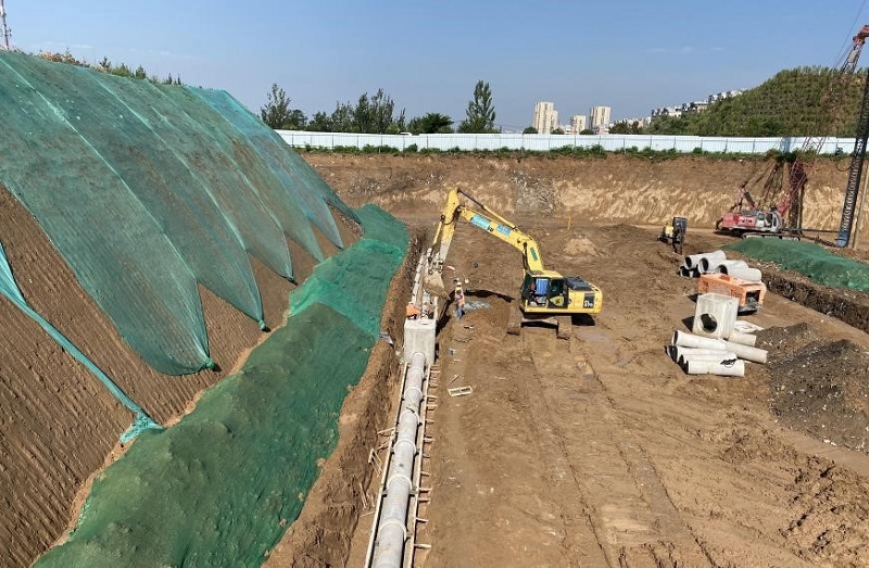 該工程雨污水管道、電力隧道的部分管線為深溝槽作業(yè),溝槽平均深度為4米,最深處達6米。同時,該工程部分路段涉及挖方量大的情況,這些都增加了施工難度和危險系數(shù)。項目部技術(shù)人員根據(jù)施工現(xiàn)場實際情況,共同研究應(yīng)對措施,制定了《深溝槽開挖專項方案》和《大挖方邊坡修整、支護方案》,采取了分級放坡開挖和邊支護邊開挖的方式,有效防止兩側(cè)土體的塌落;在挖方路塹施工時,及時掛網(wǎng)噴漿,有效維護了邊坡穩(wěn)定;在開挖坡頂設(shè)置了截水溝,有效防止雨水的溝槽和邊坡的沖刷和浸泡,增加了施工的安全系數(shù),切實保證了在溝槽和路塹開挖段內(nèi)作業(yè)機械和人員的安全。