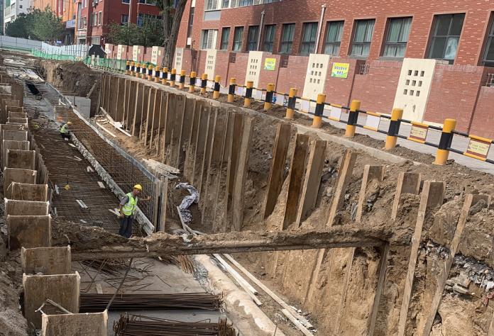 施工中,面對無法開展大面積施工,且施工路段無放坡條件等難題,項目部迅速行動、倒排工期,將工期分解到周、計劃到天,各項安排落到實處,明確全員崗位職責(zé),組織機械和人工齊上陣,同時展開多個作業(yè)面,加速推進工程進展。在黑土巷中橫馬路郝家溝路段施工中,項目部采用打設(shè)鋼板樁支護措施,有效保障周邊建筑物安全,且該路段施工場地緊鄰學(xué)校,為不影響師生九月初正常通行,項目部安排施工人員加班加點對周邊拆遷產(chǎn)生的大量建筑垃圾和渣土進行清運,并集中力量加快推進該路段的施工進度,組織人員晝夜輪替兩班倒,確保趕在正式開學(xué)前完成施工任務(wù)。