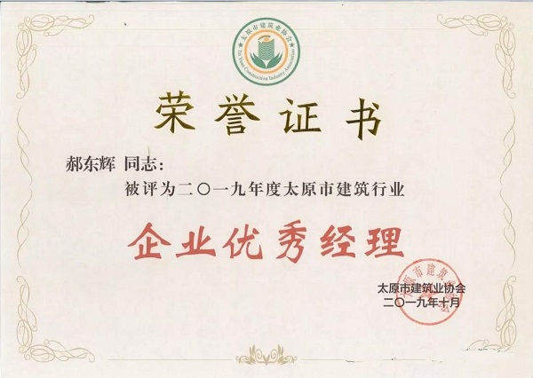 集團(tuán)公司黨委書(shū)記、董事長(zhǎng)郝東輝榮獲“2019年度太原市建筑行業(yè)企業(yè)優(yōu)秀經(jīng)理”榮譽(yù)稱號(hào)。