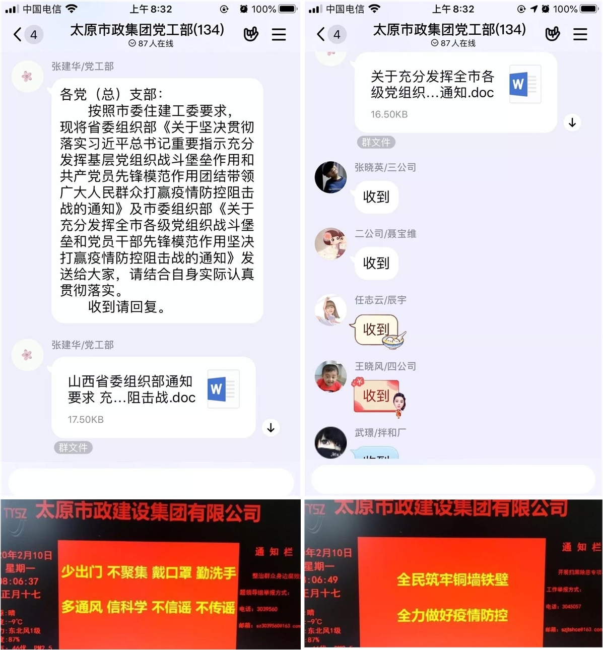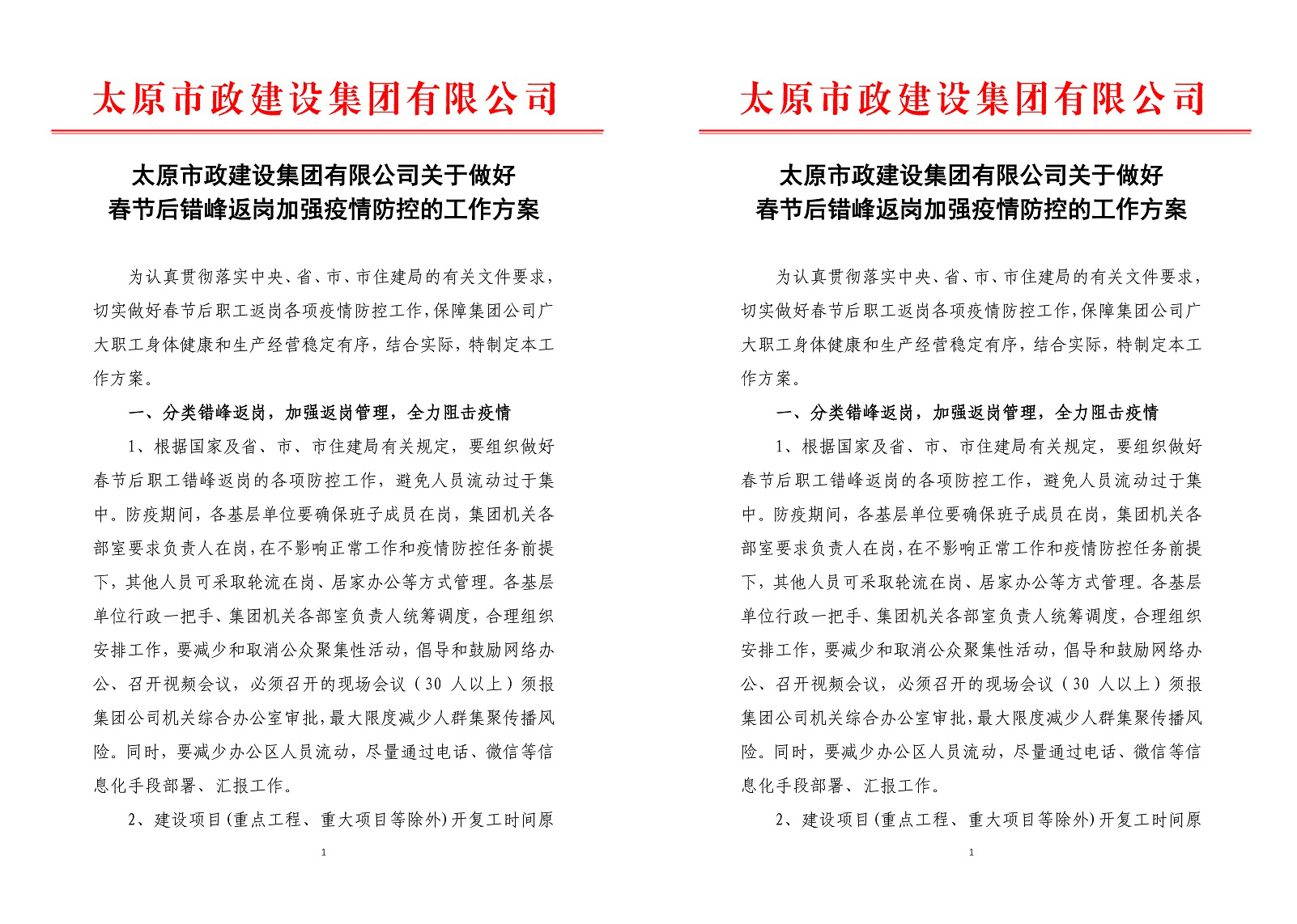 統(tǒng)一指揮,確保領(lǐng)導(dǎo)組織到位。為有效應(yīng)對新冠肺炎疫情,集團公司迅速制定《太原市政建設(shè)集團有限公司新型冠狀病毒防控應(yīng)急預(yù)案》,成立集團公司新型冠狀病毒感染的肺炎疫情防控工作領(lǐng)導(dǎo)小組,以強有力的領(lǐng)導(dǎo)統(tǒng)籌協(xié)調(diào)推進集團公司疫情防范和處置工作。同時,集團公司制定《太原市政建設(shè)集團有限公司關(guān)于做好春節(jié)后錯峰返崗加強疫情防控的工作方案》,對職工復(fù)工前以及返程中個人防護、網(wǎng)上辦公等事項作出詳細(xì)安排和明確要求,保障集團公司廣大職工身體健康和生產(chǎn)經(jīng)營穩(wěn)定有序。