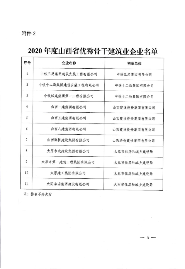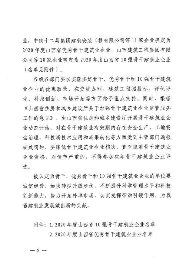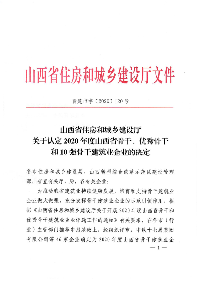近日,山西省住房和城鄉(xiāng)建設(shè)廳發(fā)布《關(guān)于認(rèn)定2020年度山西省骨干、優(yōu)秀骨干和10強(qiáng)骨干建筑業(yè)企業(yè)的決定》,集團(tuán)公司再次被認(rèn)定為“山西省優(yōu)秀骨干建筑業(yè)企業(yè)”。