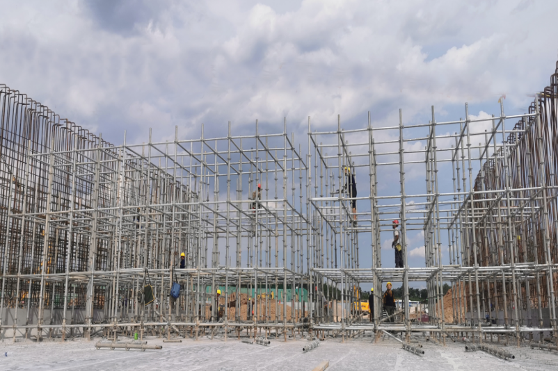 支架搭設(shè)提質(zhì)量 該工程在由東向西下穿東山過境高速公路的施工中,設(shè)計有1座長65米、寬33米、高8米,單孔跨徑為18米的四孔通道箱涵。依據(jù)國家相關(guān)規(guī)定,該通道施工屬于超過一定規(guī)模且危險性較大的分部分項工程,需要組織專家對施工方案進行論證。項目部提前謀劃,開工伊始責成相關(guān)技術(shù)人員制定專項方案,在六月中旬順利通過了專家論證,為后續(xù)施工奠定了堅實基礎(chǔ)。針對該通道墻板厚、荷載大、支模架搭設(shè)跨度寬的情況,項目部按照規(guī)定要求,決定采用組裝快捷、使用方便、節(jié)省費用、安全性達標的盤扣式鋼管支架進行打設(shè),確保高支?;炷翝仓踩€(wěn)定,有效保證了頂板支架搭設(shè)的施工安全。