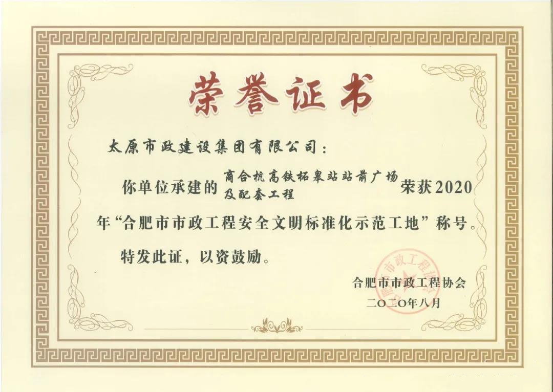 近日,由集團(tuán)公司承建的“商合杭高鐵柘皋站站前廣場(chǎng)及配套工程”被合肥市市政工程協(xié)會(huì)評(píng)為“2020年合肥市市政工程安全文明標(biāo)準(zhǔn)化示范工地”。