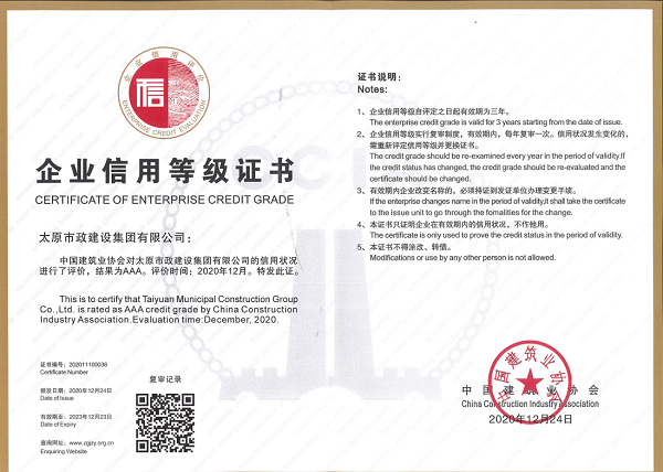 2020年12月24日,集團(tuán)公司順利通過中國建筑業(yè)協(xié)會信用企業(yè)AAA級復(fù)評,證書有效期延至2023年12月23日。