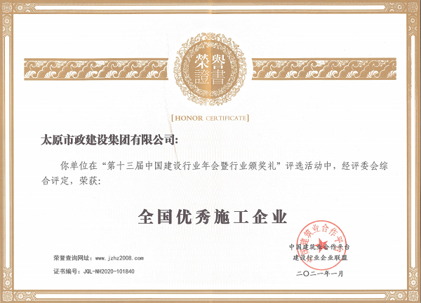2021年1月,中國建筑業(yè)合作平臺建設(shè)行業(yè)企業(yè)聯(lián)盟召開“第十三屆中國建設(shè)行業(yè)年會暨行業(yè)頒獎禮”,會上,集團(tuán)公司榮獲“全國優(yōu)秀施工企業(yè)”榮譽(yù)稱號。